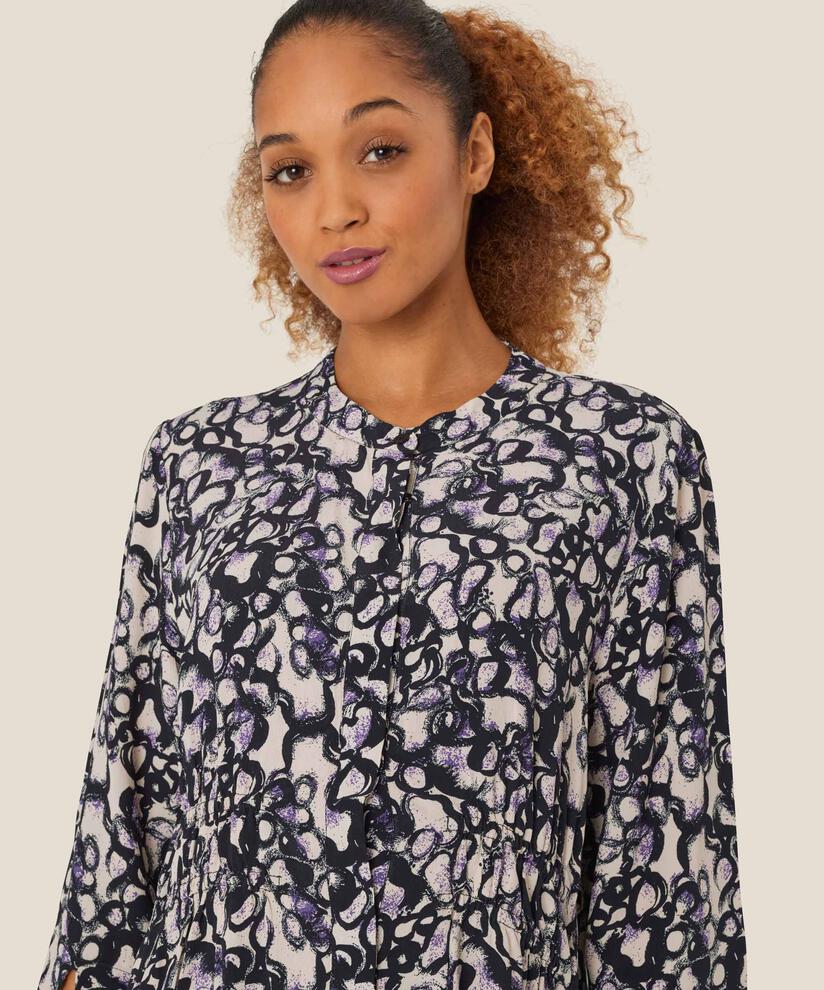 Tunikaen er laget av kreppviskose, noe som gjør den myk og behagelig å ha på, og den elastiske midjen fremhever det figursydde snittet uten å stramme.