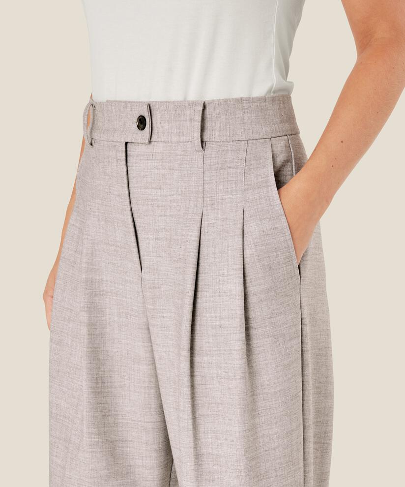 En dress trenger ikke være stiv for å være elegant. Disse stilige dressbuksene er myke og behagelige å ha på og ser bra ut med vår matchende jakke eller med en feminin topp eller skjorte. Buksen med høyt liv har et ekstremt flatterende snitt og er designet med folder foran, en liten strikk i midjen bak og lange, løse og luftige ben. Perfekt for et stilig utseende med kompromissløs komfort.