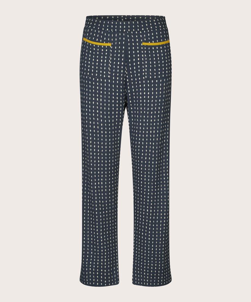Disse mørkeblå buksene med prikker utstråler kul eleganse og et snev av 70-tallsvibe. Den myke jerseykvaliteten sikrer en behagelig passform, mens det smale snittet med cropped lengde og en liten bootcut gir buksene et moderne og sofistikert uttrykk. De dypt gule kantbåndene på de dekorative lommene foran skaper en vakker kontrast, som gir det klassiske mønsteret ekstra karakter. Style buksen med en mønstrete topp eller skjorte for en helhetlig look som balanserer det avslappede med det elegante.