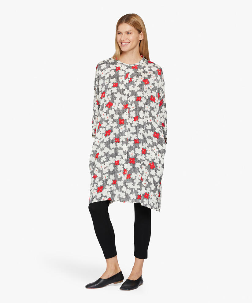 Liker du å ha litt ekstra volum i klærne dine? Da er denne skjortekjolen noe for deg. Det løse, avslappede snittet faller flott og skaper en enkel og vakker silhuett. Kjolen er dekorert med sort-hvite striper og vakre blomster som gir et modig og stilrent uttrykk. I tillegg byr kjolen på en rund hals og et par diskrete lommer i sidene som du kan stikke hendene ned i.