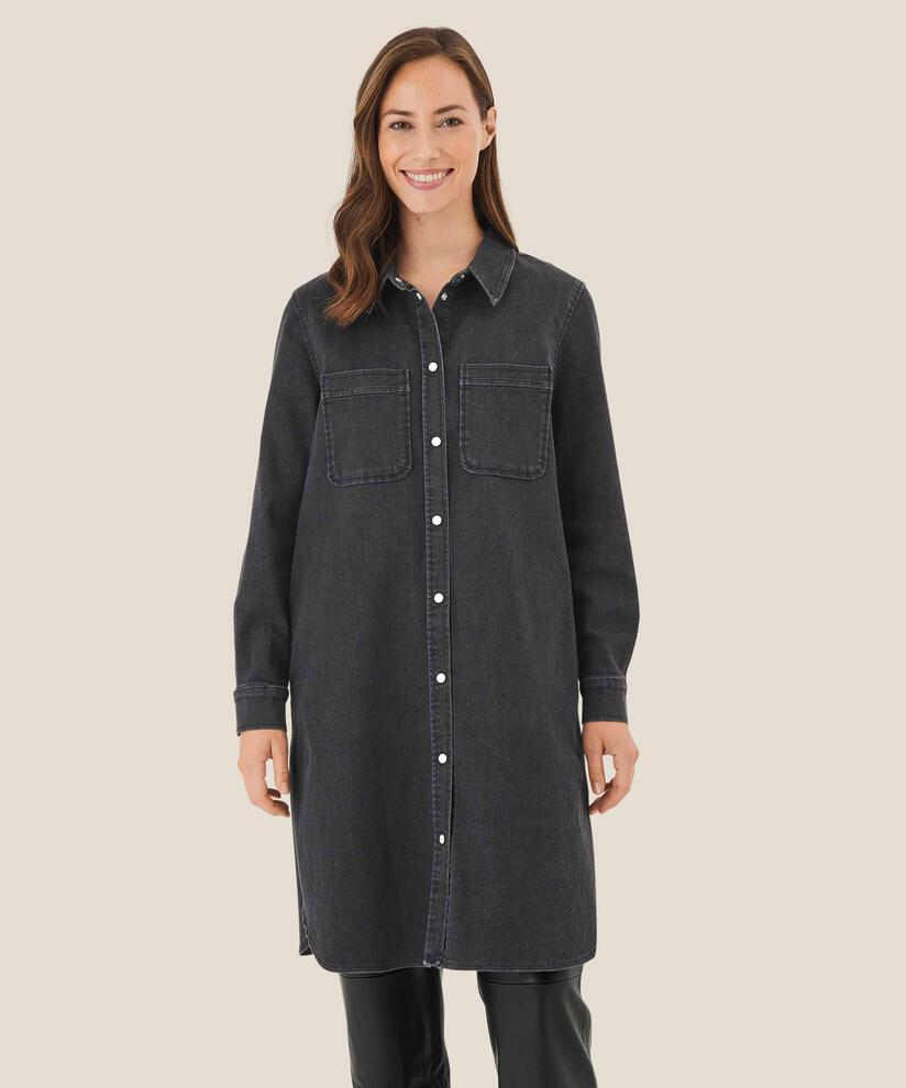 Denne svarte denimskjortekjolen skaper den perfekte kombinasjonen av feminint og kult. Kjolen er designet med skjortekrage, trykknapper og dekorative brystlommer, og den myke denimen har mye stretch, så den er super å ha på. Den gir også en fin avrunding i bunnen med høye splitter på sidene. Skap en komplett denimlook med et par sorte jeans under, eller bruk den åpen som en lett jakke over en mønstret kjole eller tunika. Den kan gjøre alt!