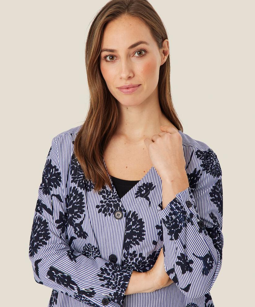 Et vakkert mønster kan friske opp ethvert antrekk, og denne skjorten har både striper og blomstermønster. Skjorten er sydd i myk bomull og har et feminint A-snitt med god komfort, men det er de små detaljene som utgjør forskjellen. Den er designet med en dyp V-hals, svarte kontrastknapper og små draperinger på ryggen. En flott skjorte for et feminint bohem-uttrykk.