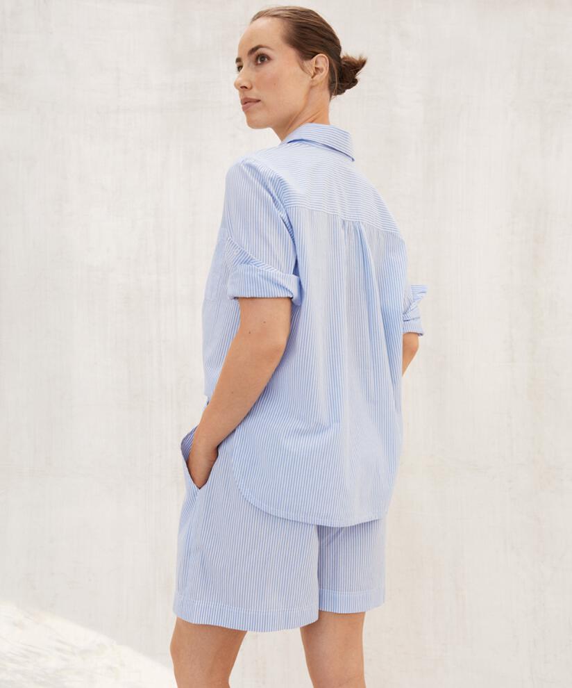 Denne stripete bomullsskjorten er perfekt til dager når du vil være ekstra god mot deg selv. Det ledige snittet og de herlige nålestripene innbyr til hygge og avslapping. Skjorten er designet med en enkel brystlomme og små draperinger på ryggen som gir den en feminin touch. Brett opp ermene og style skjorten med et par myke leggings eller vår matchende shorts for en gjennomført look.