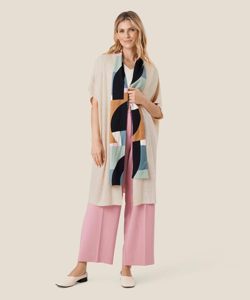 Selv et lite skjerf kan ha stor effekt, og dette mønstrete skjerfet er intet unntak. Det er fremstilt i et dobbelt lag av myk og behagelig viskose, og den smale designen gir et lett og elegant uttrykk. La det henge løst og flatterende om halsen, eller knyt en sløyfe rundt halsen for et feminint og elegant preg.