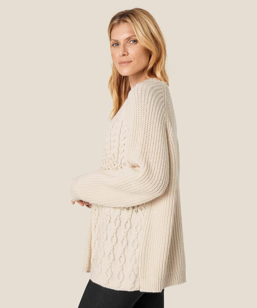 Sesongen for lag på lag er her, og hos Masai kan det ikke bli mykt og lekkert nok. Nyt følelsen av dette oversize strikkeplagget som er strikket i en myk kvalitet med bomull. Plagget er designet med et flott ,strikket mønster som gjør uttrykket ekstra interessant og har en herlig lengde med splitter i sidene. Style den med yndlingsbuksen din og et mykt skjerf om halsen for stilfull komfort.